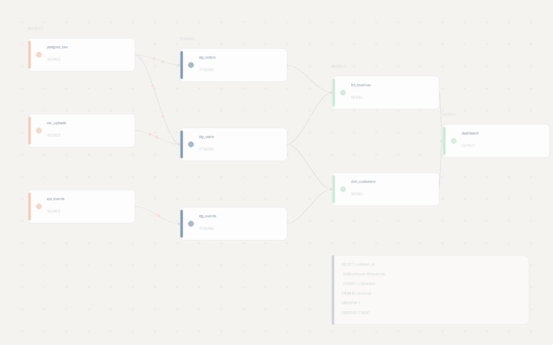 See your entire data workflow at a glance. Connect nodes to transform data, create dependencies, and build interactive dashboards on an infinite, zoomable canvas.